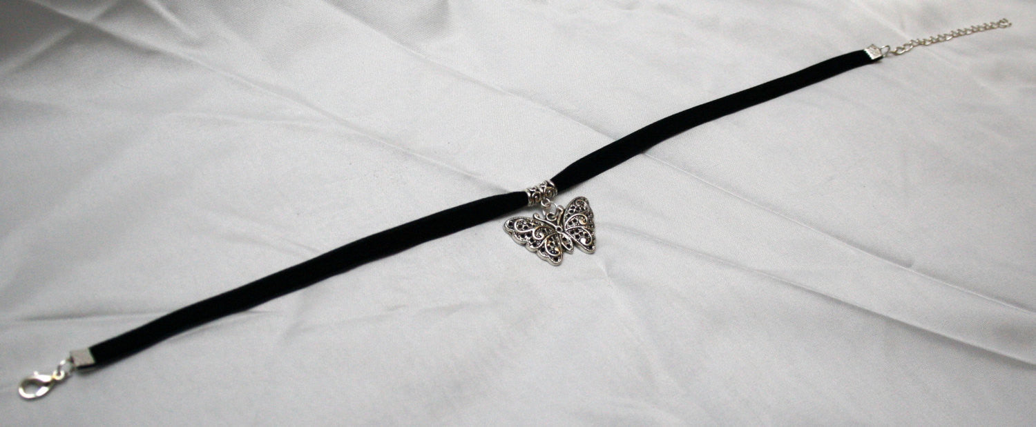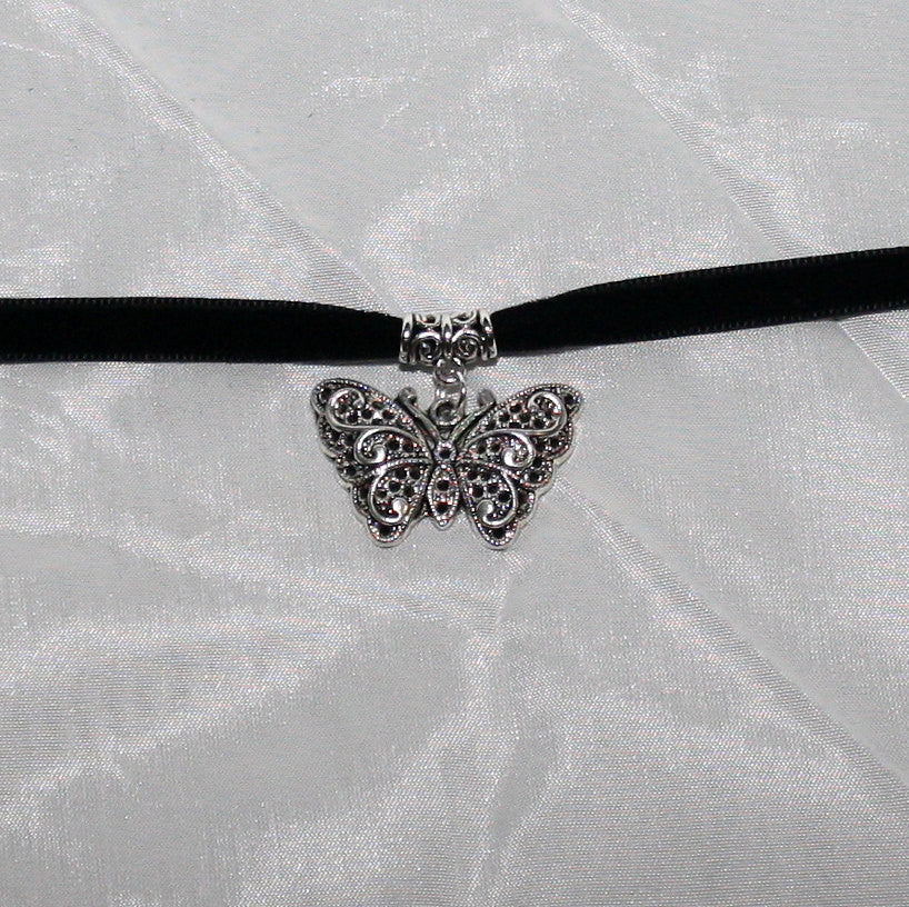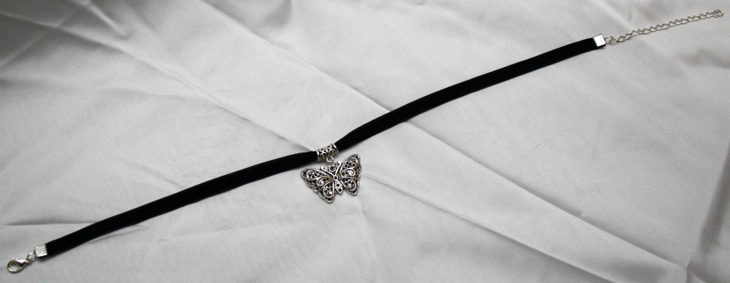Silver tone filigree butterfly pendant on burgundy velvet choker with small key charm hanging from the extension chain.
