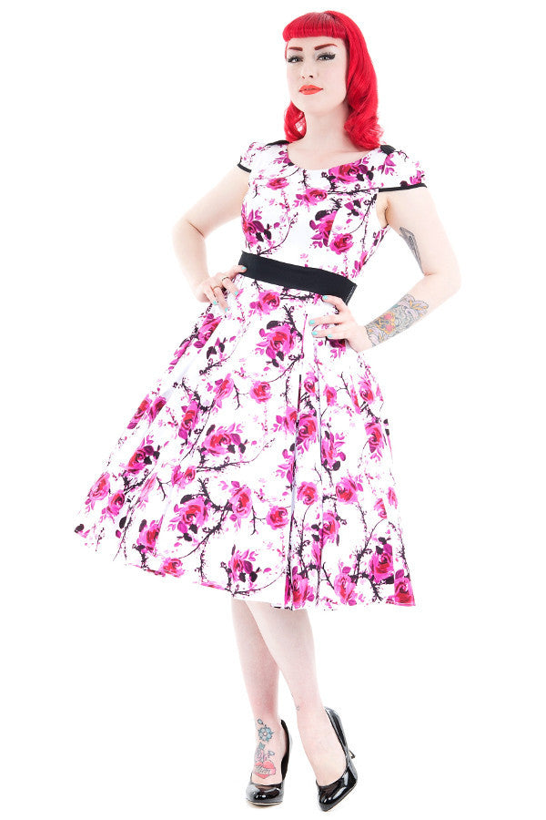 - a delicate magenta rose and cherry blossom design on a crisp white background;