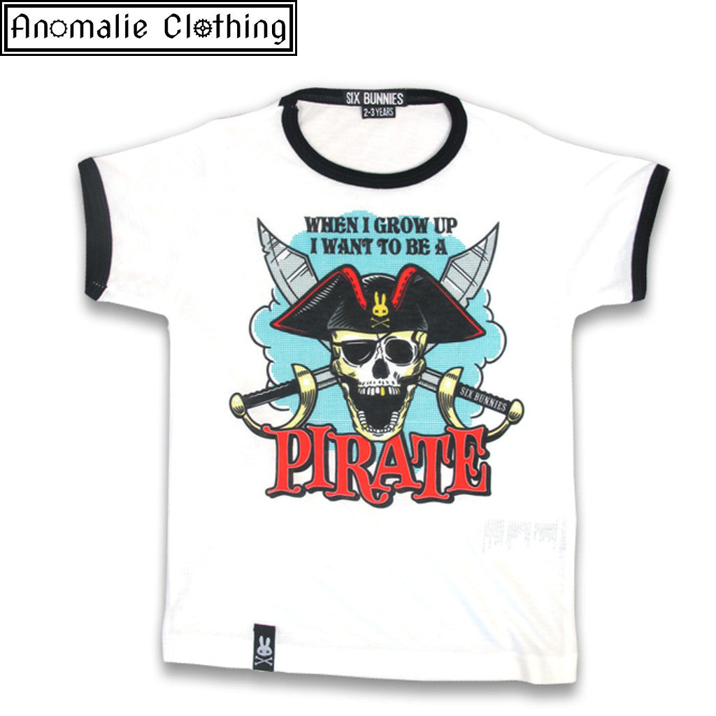 - a pirate skull with a gold tooth, wearing an eye patch and tricorne hat, crossed cutlass swords in the background, and the words "When I grow up I want to be a Pirate",